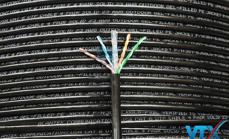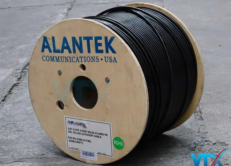 Cáp mạng Alantek Cat6 UTP ngoài trời có Lõi đồng nguyên chất chuẩn 23AWG được ủ mềm và bọc nhựa PE, Có chất làm đầy (dầu). Cáp thường được sử dụng cho các đường truyền khai thác ngoài trời như các hệ thống camera giám sát, hệ thống an ninh hay đường truyền dẫn từ các điểm với nhau.